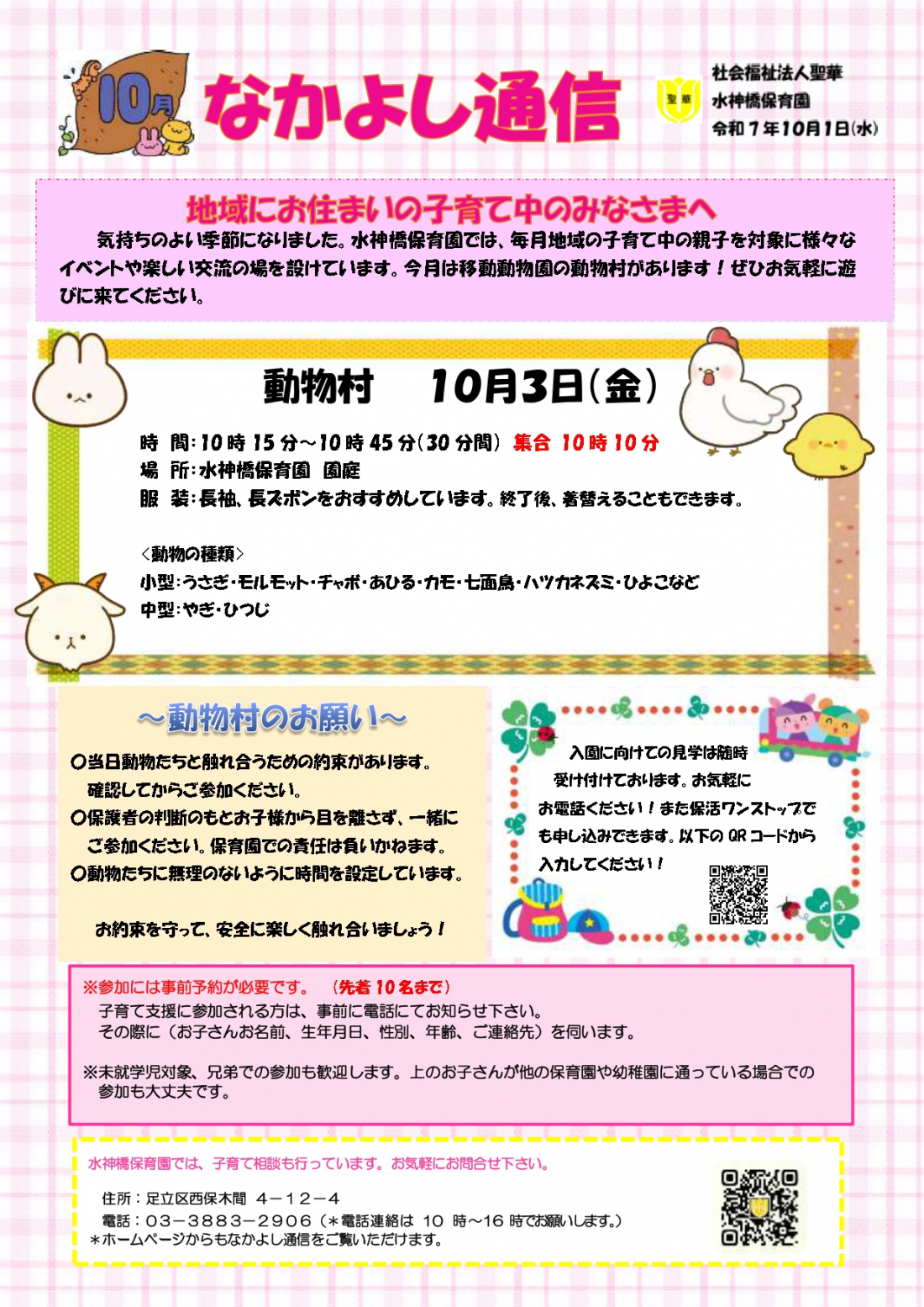 なかよし通信 10月号です。今月は移動動物園の動物村があります。ヤギやウサギ、モルモットなどの可愛い動物たちと触れ合えます☆ぜひ遊びに来て下さい!