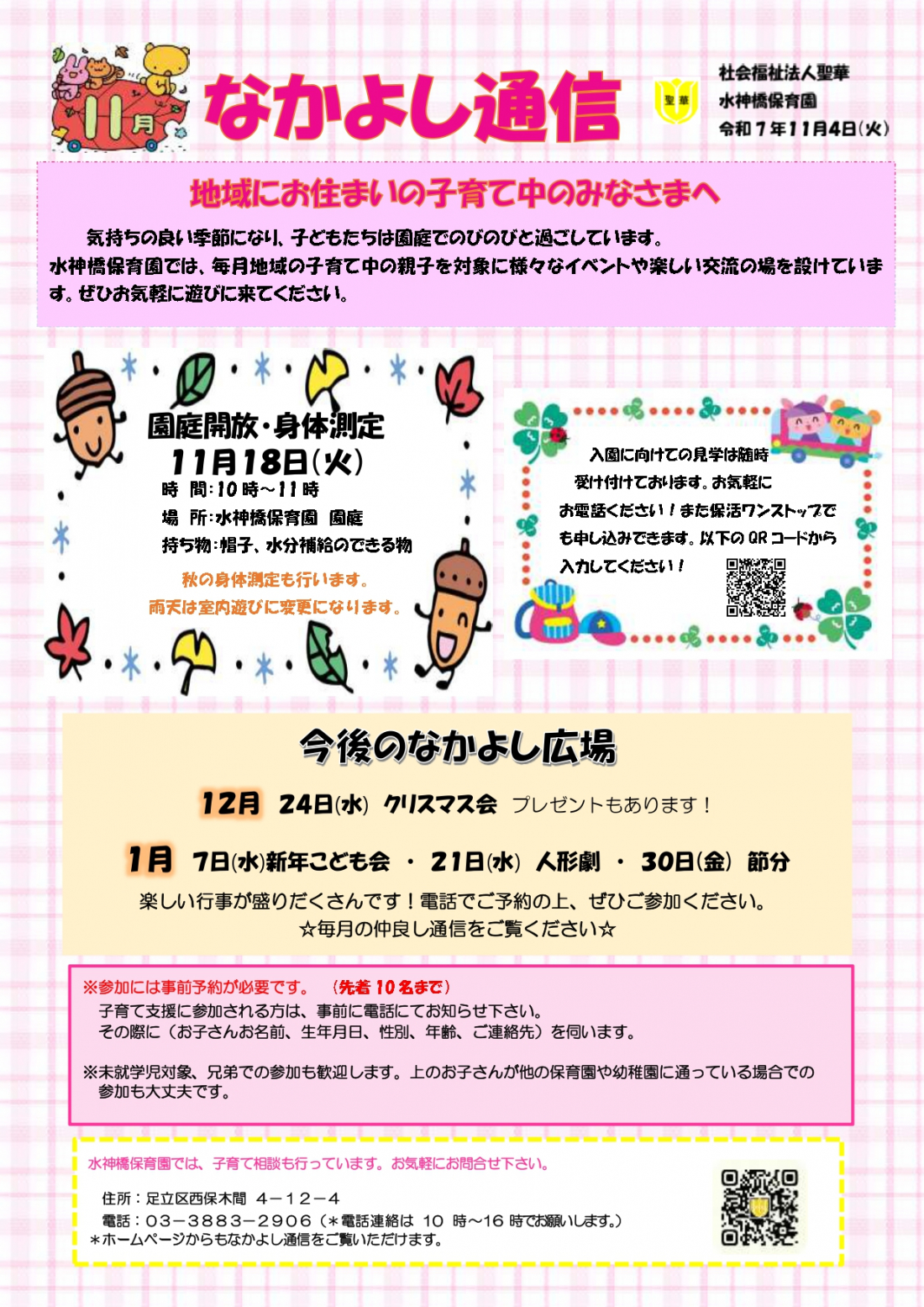 なかよし通信11月号です。今月は園庭開放と身体測定を予定しております。(雨天時は室内遊びに変更になります)ぜひ遊びに来て下さい!