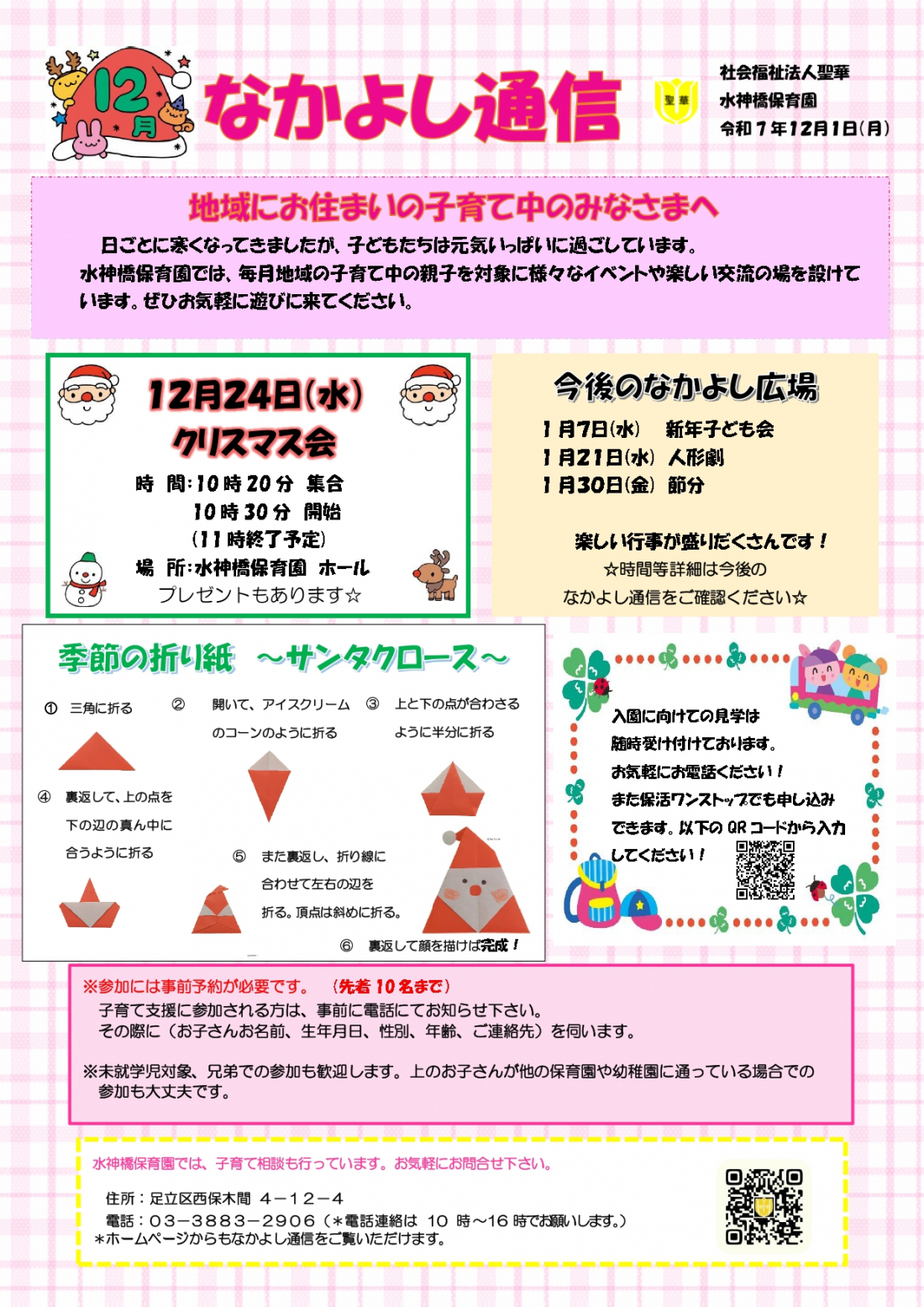 なかよし通信12月号です。今月はクリスマス会があります!来月も楽しい行事が盛りだくさんです。たくさんのご参加お待ちしております。