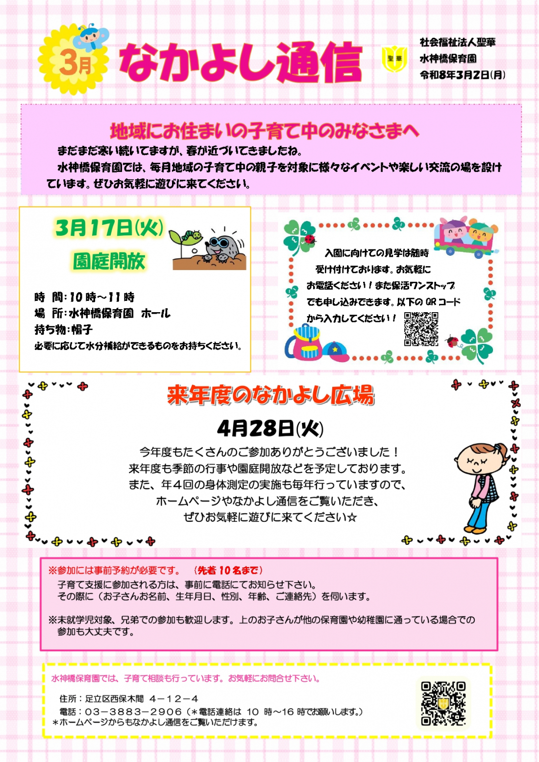 なかよし通信3月号です。今月は園庭開放です。ぜひ遊びに来てください。
